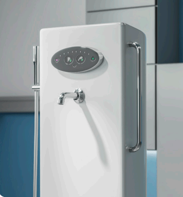 Il centralise la robinetterie, le mitigeur et la douchette pour faciliter la gestion de l’eau et améliorer la fluidité des soins autour de la baignoire d’accouchement.