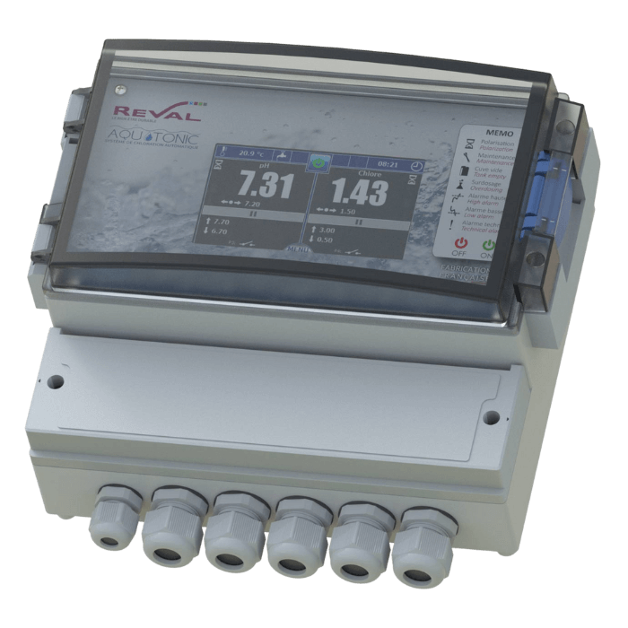 Ce système de chloration automatique Aquatonic permet de répondre à vos attentes en termes de contrôle de la qualité de l’eau. Il mesure, régule et contrôle le pH et le chlore des bassins et piscines (spas, thalassos, hôtels…), tout en vous proposant une lecture de la température.